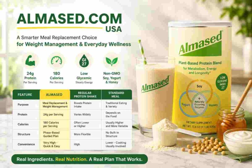 Almased.com USA presents Almased as more than a protein supplement. It is a meal replacement system built around a high-protein formula, clear serving instructions, and a phased approach to weight management. The brand emphasizes non-GMO soybeans, yogurt, honey, low glycemic impact, and a structured daily routine.